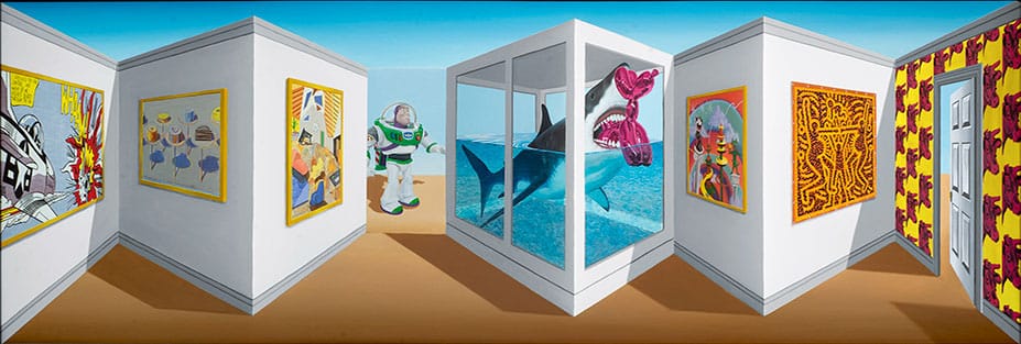 Born Peter David Hughes in 1939 in Birmingham, England, the painter created “Sticking-out Room,” his first “Reverspective,” in 1964 after studying at Leeds Day Training College. On the day of his graduation, his first exhibition took place at the Portal Gallery in London. Currently living and working in London, England, Patrick Hughes continues to follow the traditions of Pop art, optical art, and surrealism.